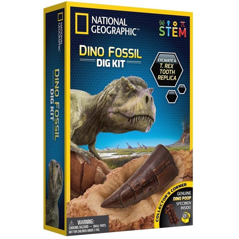 Detta set innehåller en replika av en T-Rex tand i skala 1:1 för utgrävning, samt en äkta dinosaurie fossil - en dino-poop!
