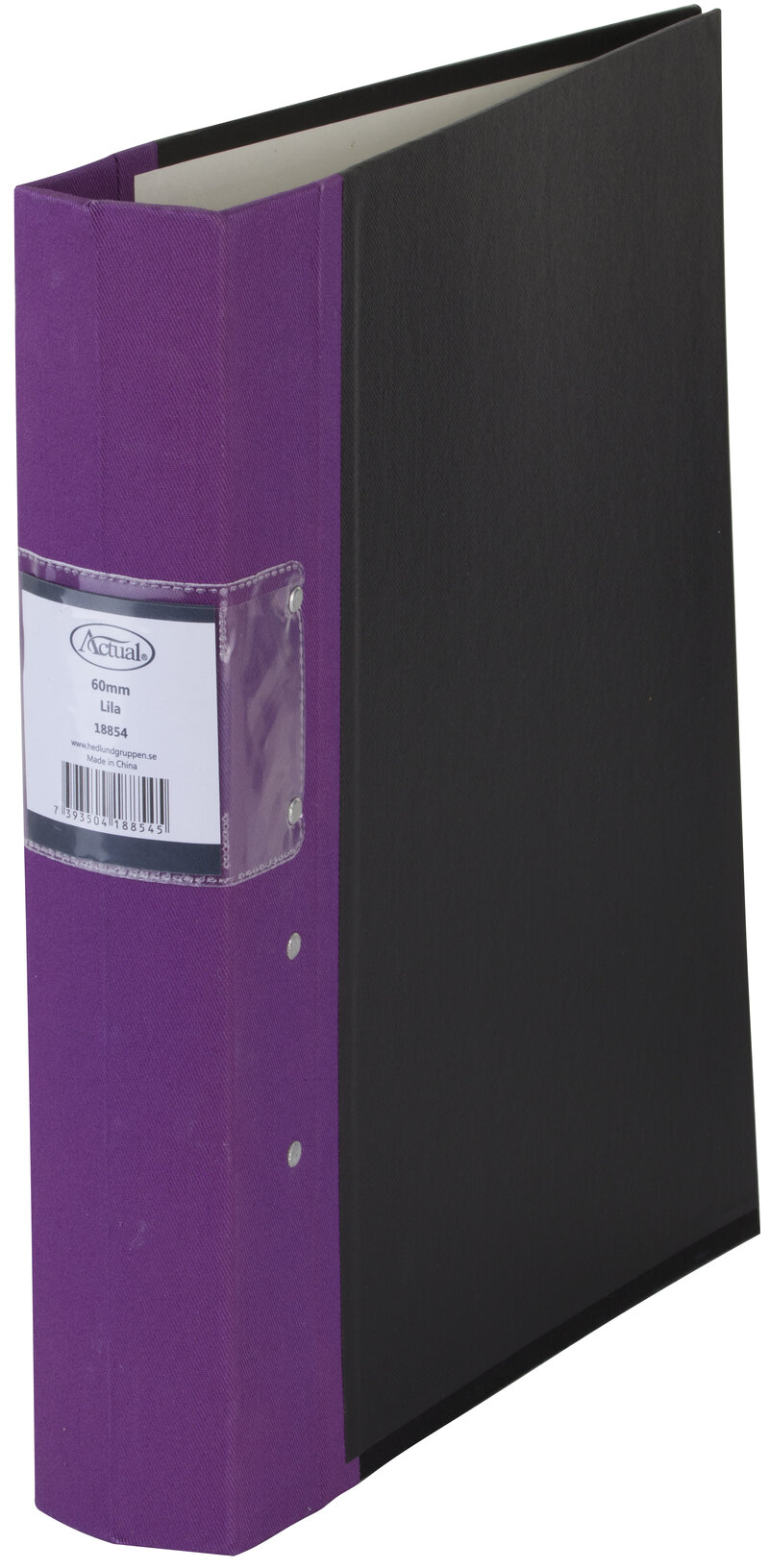 Gaffelpärm med tygklädd trärygg, och etiketthållare av plast.