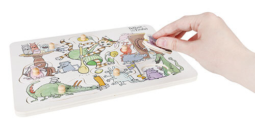 Ett knopp-pussel i trä, med fina motiv av gubben Pettson och katten Findus. Knopparna i trä är lätta att greppa och pusslet är perfekt som ett första pussel till den lilla. Tillverkat i kryssfanér. 1+